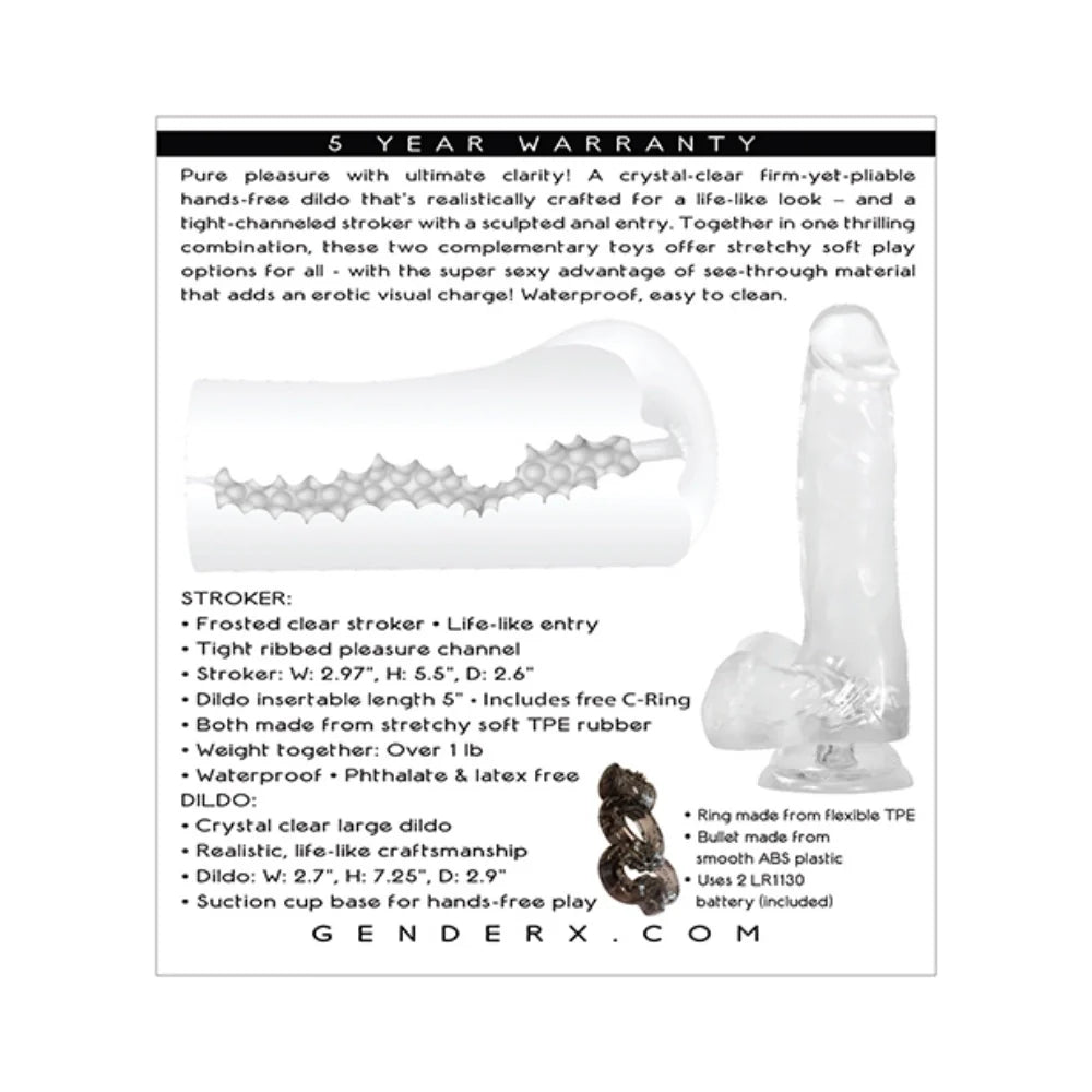 The Transparent Dildo & Anal Stroker Set delivers both visual and physical satisfaction in one versatile combo. This set includes a crystal-clear dildo with realistic veins and a sturdy suction base, paired with a frosted anal stroker designed with a lifelike entry and ribbed inner texture for enhanced stimulation.